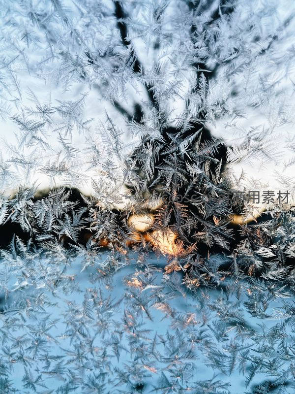 透过布满霜花的玻璃窗,远处的暖黄色灯光在冰冷的晶体间若隐若现,形成强烈的冷暖色调对比,营造出神秘而温馨的冬日氛围。