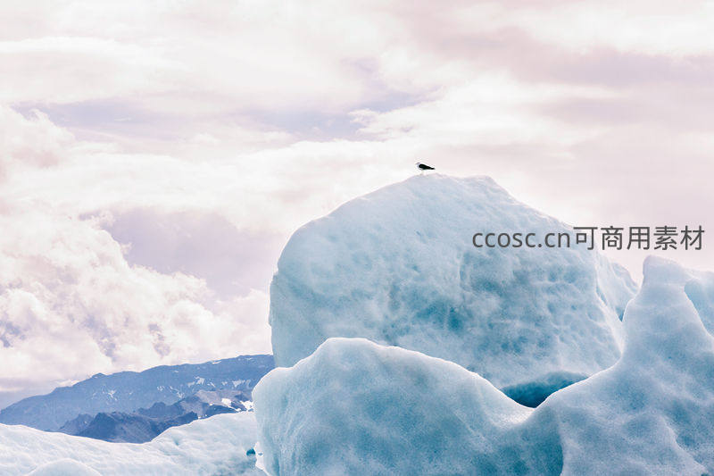 一只小鸟静立于巨大冰山之巅,背景是辽阔的云海与远山,画面宁静而壮美,展现了极地自然的纯净与苍凉。
