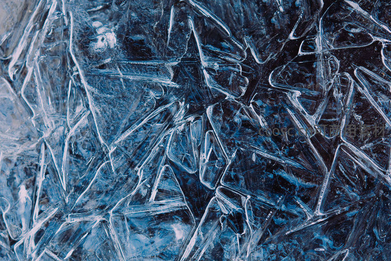 冰层内部的裂纹在微距下呈现出复杂交错的抽象图案,深蓝色调赋予其神秘感,如同大自然绘制的冷峻艺术画布。