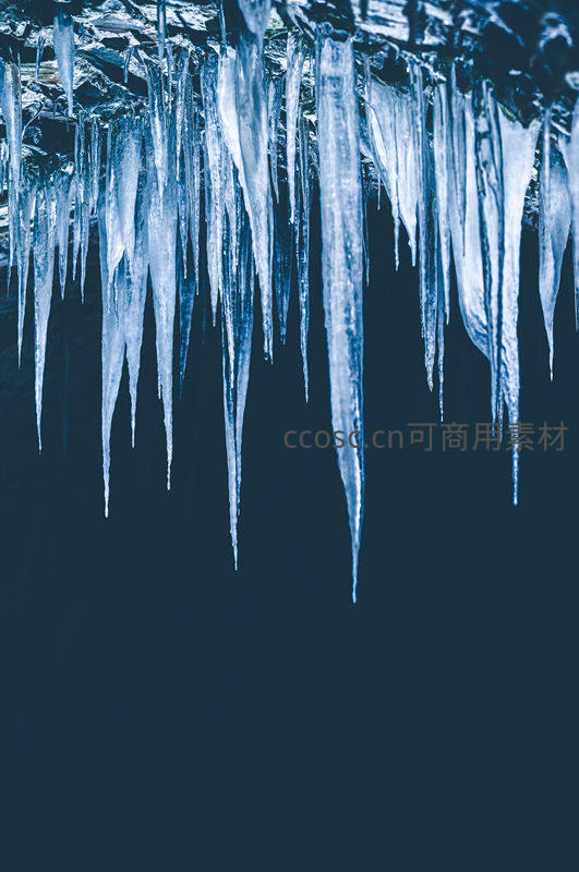 一排排尖锐的冰锥从上方垂落,晶莹剔透,反射着冷冽的蓝光,下方留白更显其悬垂之态,营造出冬日严寒的氛围。