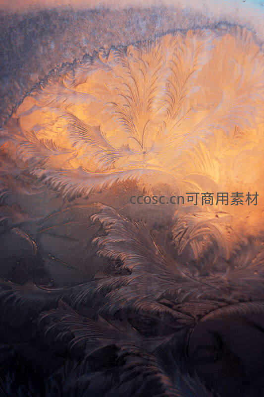 在柔和的暖色光线照射下,玻璃表面凝结的冰霜呈现出精致如羽毛般的纹理,细节丰富,层次分明,展现了寒冷中蕴藏的细腻美感和自然的艺术创造力。