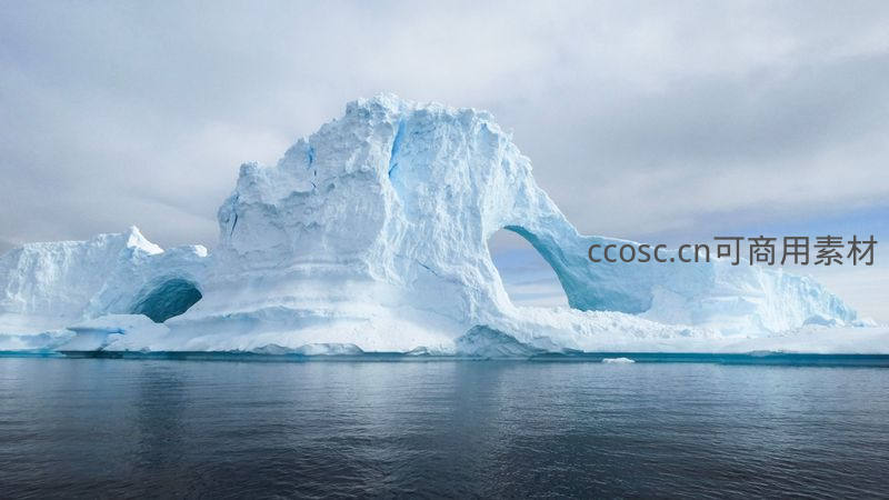 一座宏伟的冰山矗立于平静海面,其顶部自然形成一个巨大的拱形空洞,洁白的冰体与深蓝海水形成鲜明对比,展现了极地地区令人叹为观止的自然力量与雕塑感。