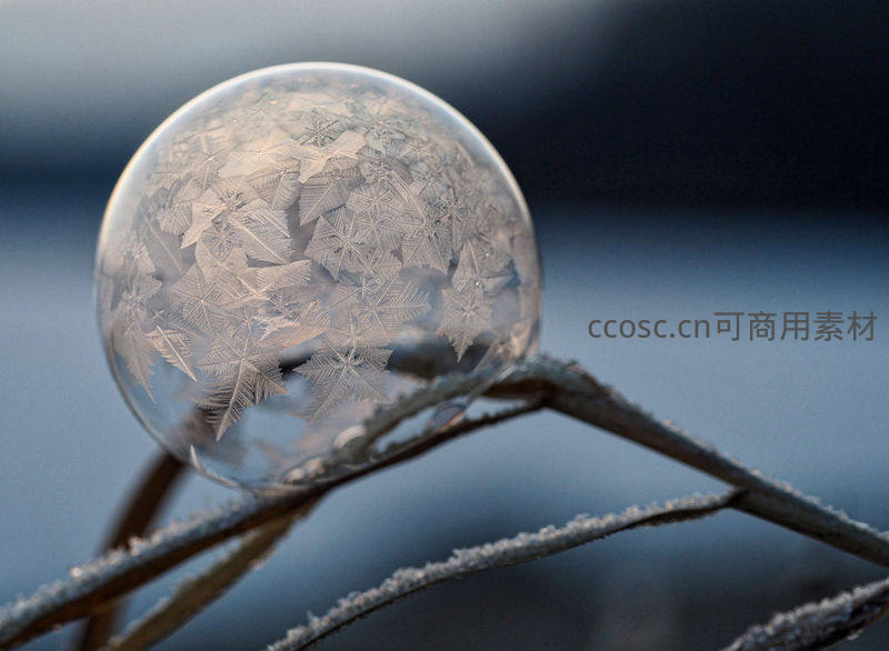 一颗悬停在枯枝上的水珠,在低温下凝结成精美的冰晶图案,如同微型艺术品,展现了自然界微观世界的奇妙与精致。