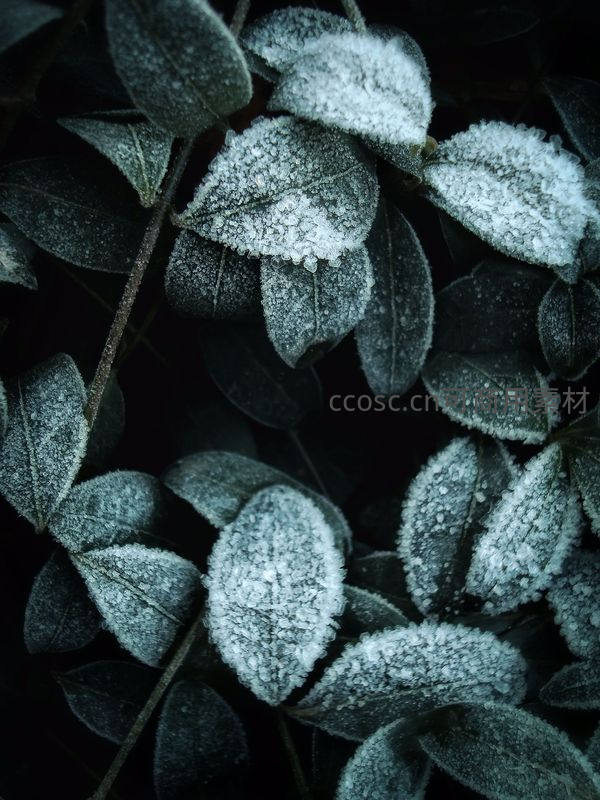 清晨的寒霜轻柔地覆盖在深绿色的叶片上,形成一层洁白细腻的结晶,为原本沉寂的植物增添了生机与诗意,仿佛冬日里的温柔低语。