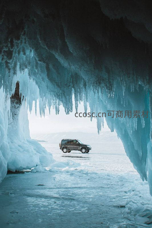 一辆黑色越野车行驶在结冰的湖面上,穿过由巨大冰柱构成的天然拱门,营造出人与自然共存的冒险氛围和视觉冲击。