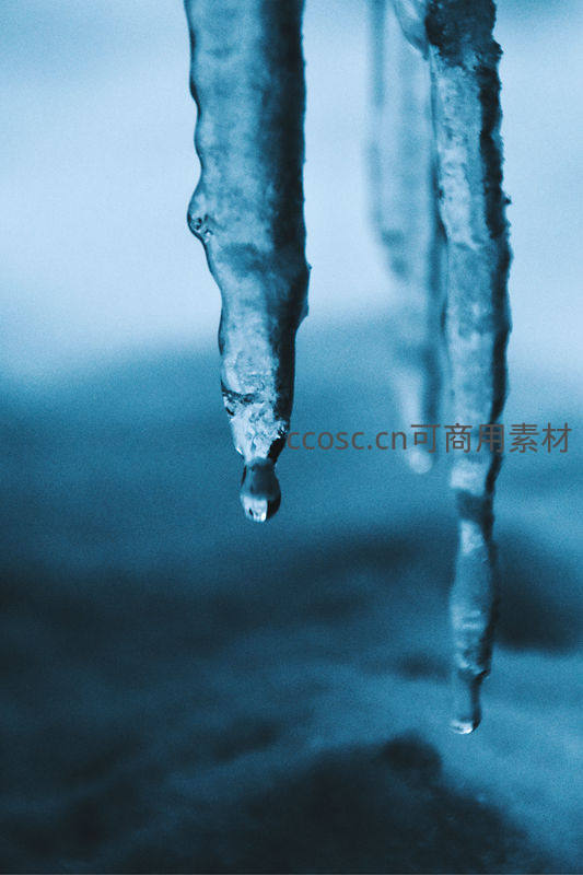微距镜头下,一根晶莹剔透的冰柱末端正凝聚着一颗即将滴落的水珠,展现了严寒中悄然发生的微妙变化。