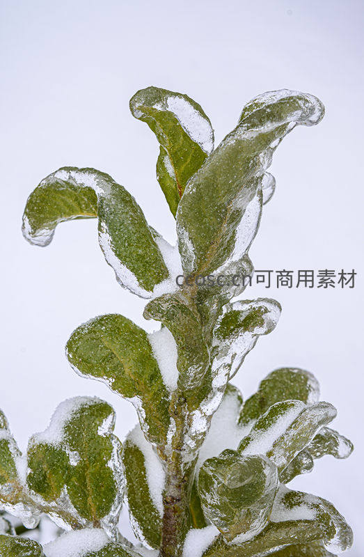 冰封绿叶特写,晶莹剔透的冬日奇景
