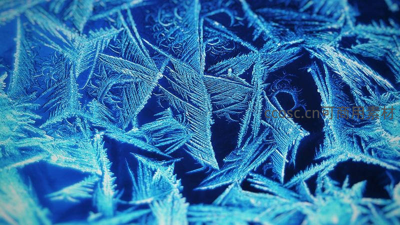 在显微镜般的视角下,冰晶以复杂的几何形态交织成一片梦幻的蓝色森林,每一片晶体都闪烁着冷冽而精致的光芒,是大自然鬼斧神工的杰作。