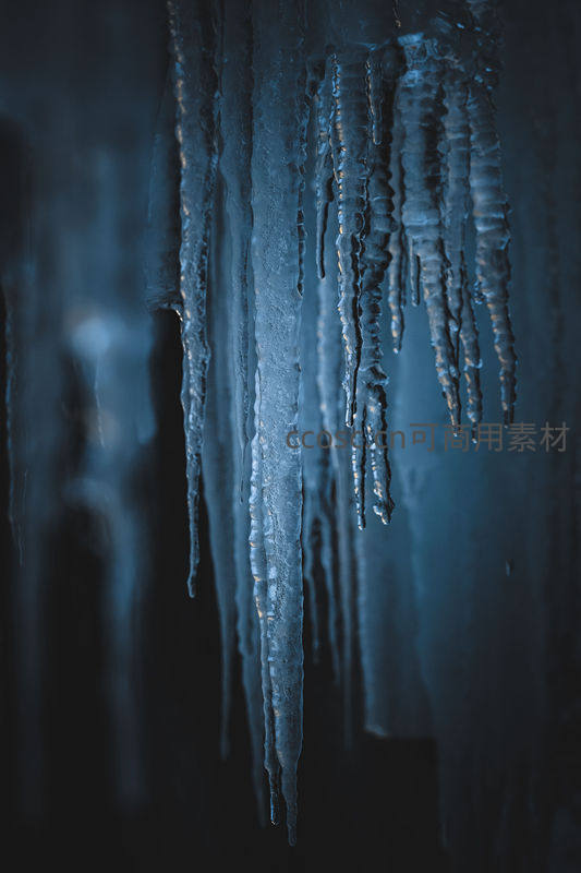 在昏暗的洞穴深处,无数冰柱从顶部垂落,表面粗糙而富有质感,在幽蓝光线的映照下,营造出一种神秘、静谧且略带压迫感的地下冰雪王国氛围。