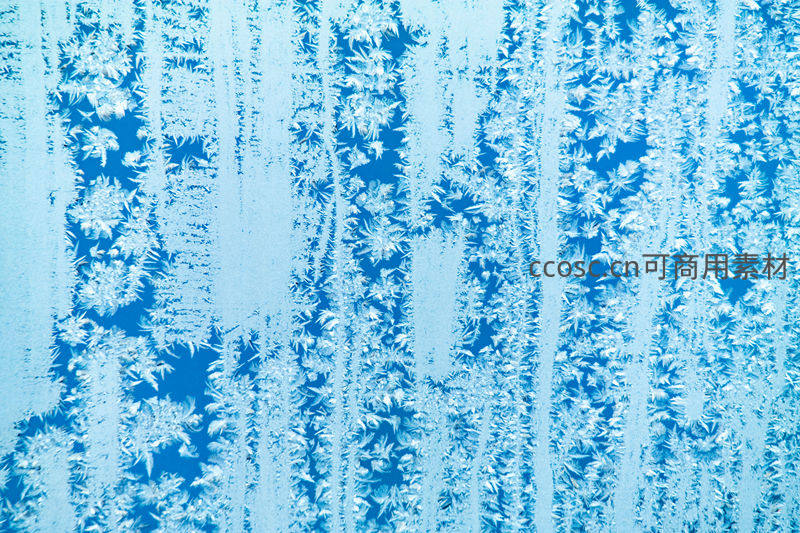 寒冷天气在玻璃窗上凝结出层层叠叠的霜花,形成垂直排列的精美图案,如同无数微型雪花在蓝色背景下绽放,是冬日里最温柔的艺术创作。
