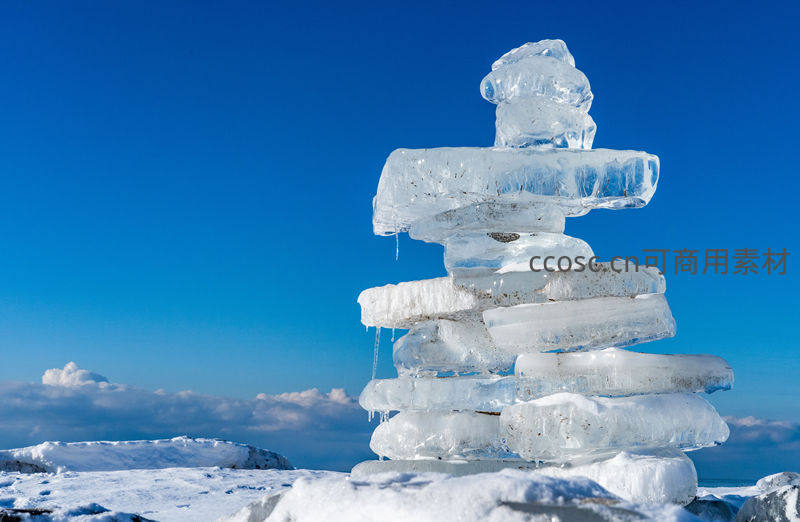 在无垠的雪原之上,一座由巨大冰块层层堆叠而成的冰塔,在晴朗的蓝天背景下显得格外雄伟壮观,充满原始的野性之美。