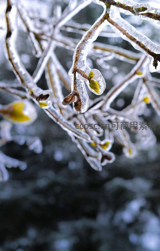 树枝被厚厚的冰层包裹,但新芽依然顽强地破冰而出,透出点点绿意,象征着寒冬将尽,生命在严酷中积蓄力量迎接春天。