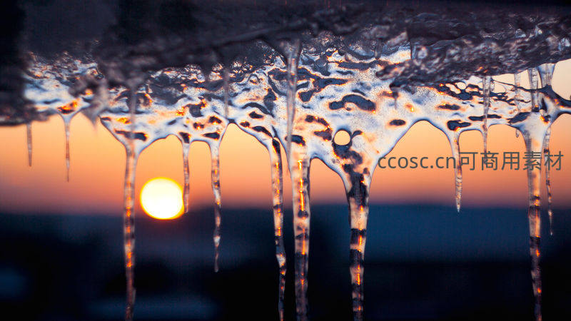 在绚烂的落日余晖中,屋檐垂下的冰凌被染成金色,冰体内部折射出温暖光芒,冷冽与温暖、坚硬与柔美在此刻完美交融。
