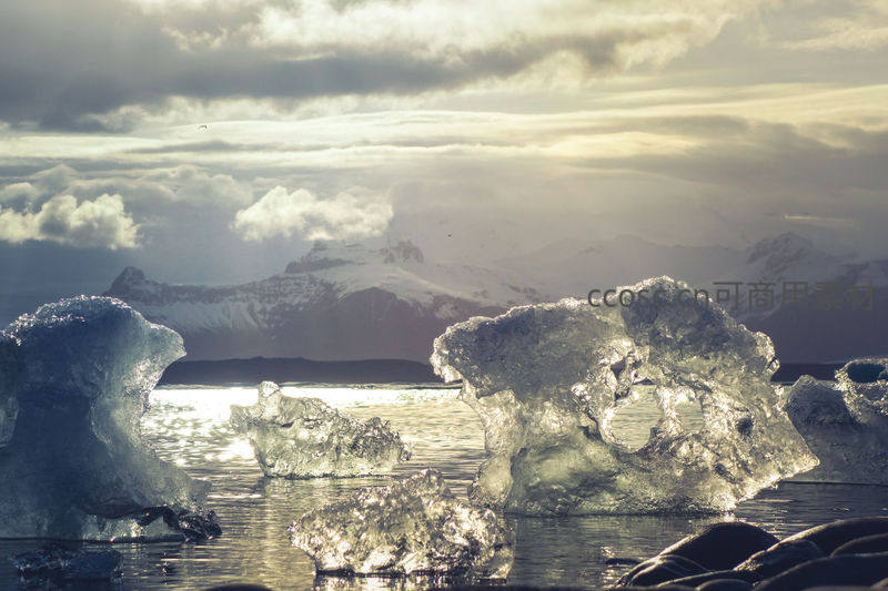 夕阳穿透云层洒在冰封湖面上,晶莹剔透的冰块折射出金色光芒,远处雪山轮廓清晰,构成一幅梦幻而宁静的北欧冬日画卷。