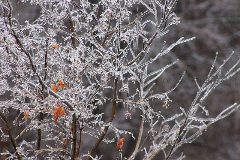 树枝被一层薄霜覆盖,形成精致的冰晶结构,几片枯黄的叶子顽强地挂在枝头,在灰白背景下构成一幅充满诗意的冬日自然画卷。
