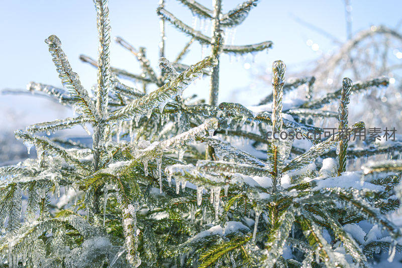 阳光透过冰封的松树枝条,凝结的冰晶如钻石般闪烁,展现了冬日森林静谧而璀璨的自然之美。