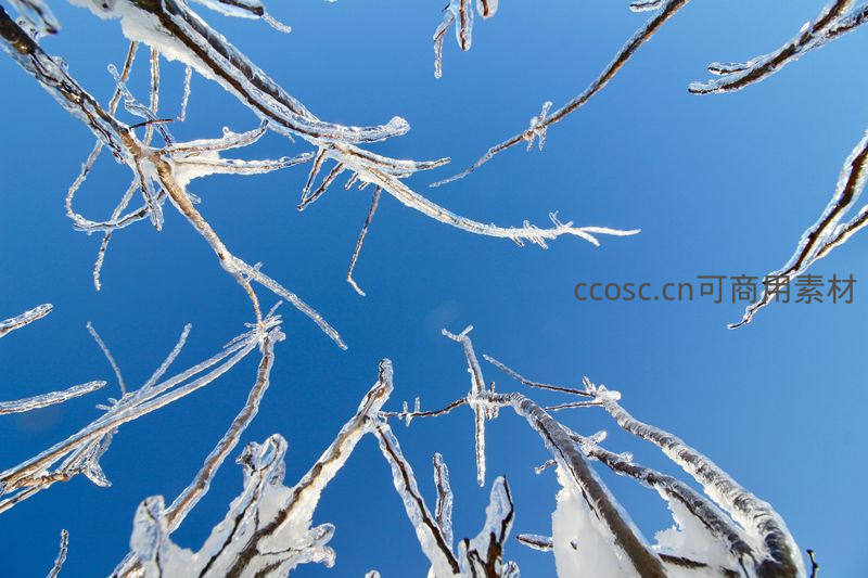 从低角度仰视被冰层包裹的枯枝,与纯净的蓝色天空形成鲜明对比,营造出空灵而冷峻的视觉效果。