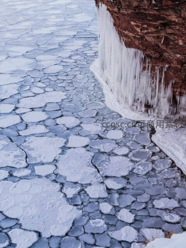湖面因低温冻结形成不规则的冰块拼图,旁边岩壁垂下壮观冰帘,构成一幅冷冽而富有几何美感的冬日画卷。