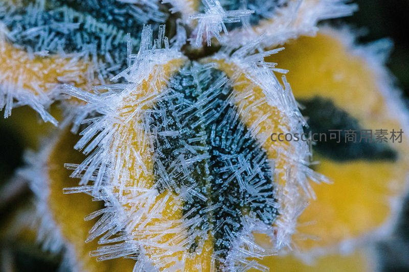 一片被细密冰晶完全包裹的黄色叶片,其脉络与霜花交织,呈现出冬日里植物生命凝固的精致纹理。
