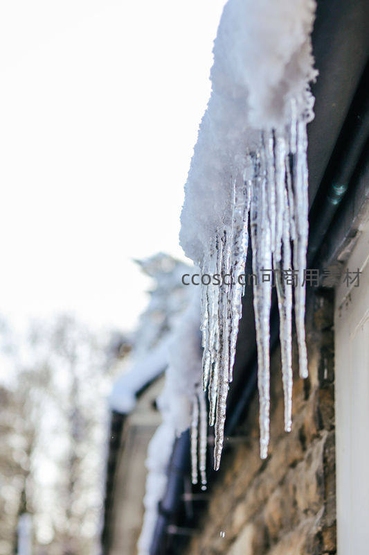 阳光下,从屋顶边缘垂下的长长冰凌晶莹剔透,底部有水滴正缓缓滴落,展现了城市冬日里融雪的生动瞬间。