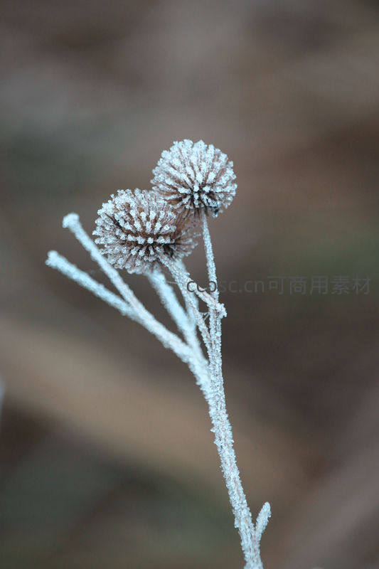 两朵干枯的球状花苞和纤细的茎秆上均匀覆盖着洁白的霜花,在模糊的背景中显得格外宁静,仿佛在等待春天的到来。