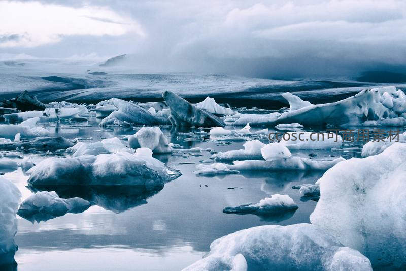 在阴云密布的天空下,冰川湖面漂浮着大小不一、晶莹剔透的冰块,倒映着灰蓝色的天光,营造出一种静谧而苍凉的极地氛围。