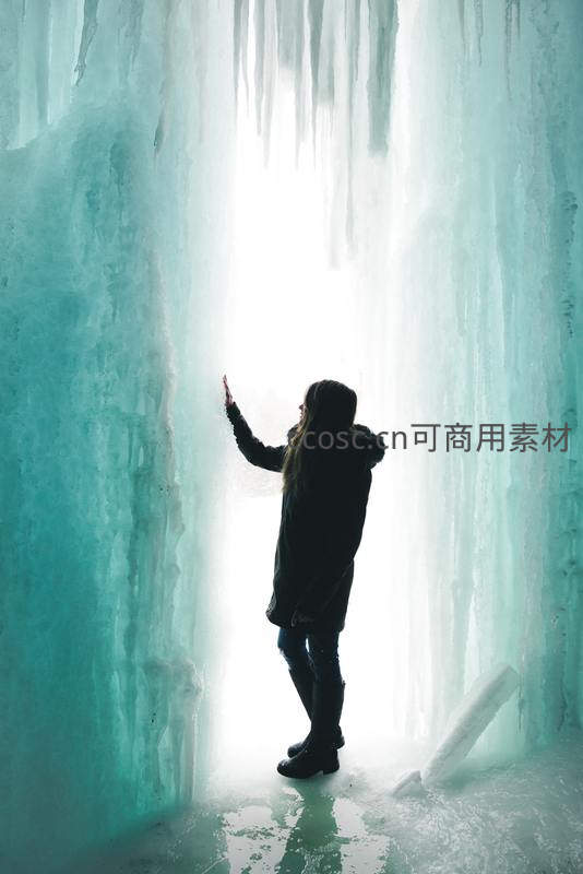 一位游客站在晶莹剔透的冰洞中,背对镜头伸出手,试图触碰从洞口倾泻而入的明亮天光,周围悬挂的冰柱折射出幽蓝光芒。