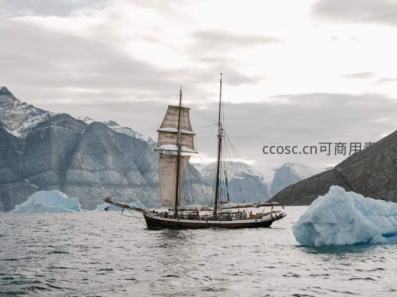 古帆船航行于冰山与雪山之间