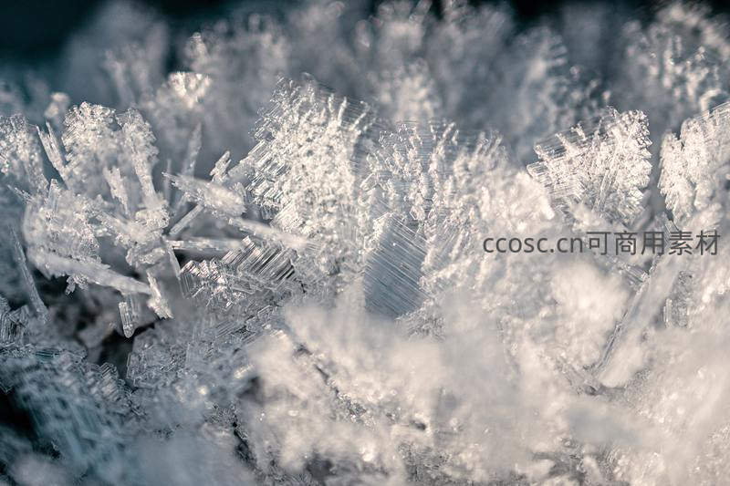 微距视角下,无数细小雪花晶体紧密堆叠,棱角分明、晶莹剔透,在柔和光线下闪烁微光,呈现冰雪微观世界的奇妙与精致。
