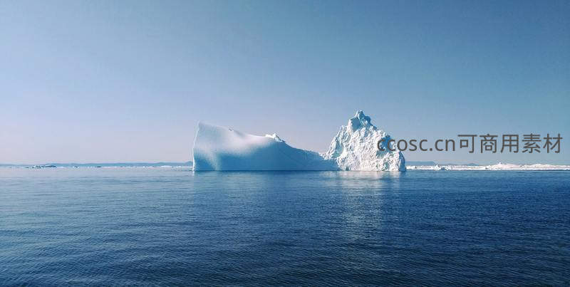 清澈海面上,一座造型独特的双峰冰山静静伫立,其洁白身躯与深蓝海水相映成趣,营造出一种遗世独立、宁静致远的极地意境。