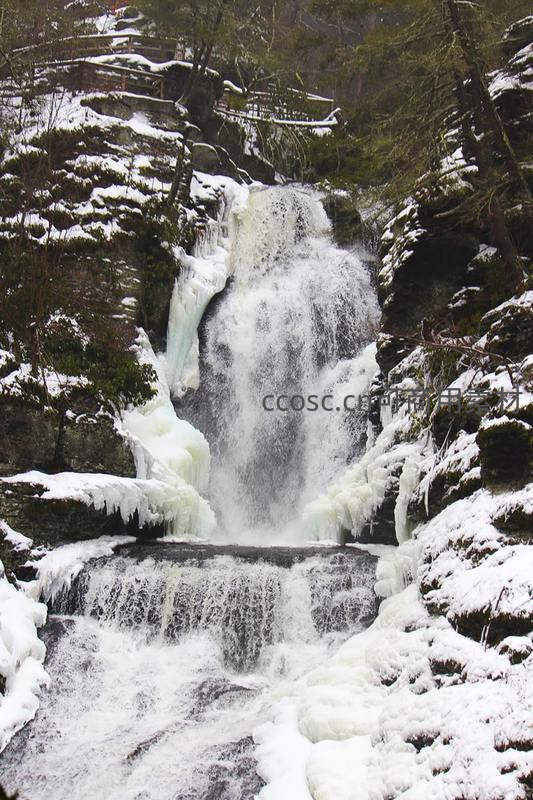 雪覆山涧瀑布,冰挂飞流气势磅礴