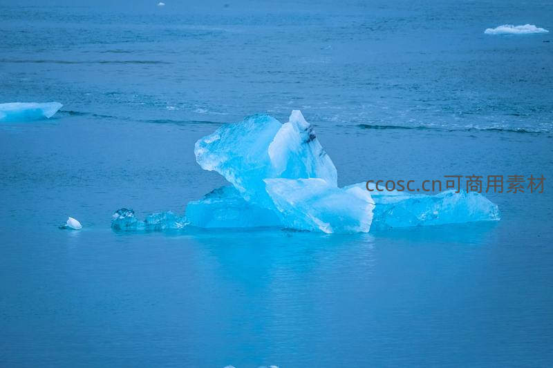 一座造型独特的冰山矗立于广阔平静的湖面中央,周围水面如镜,映衬着冰体纯净的蓝色,营造出一种遗世独立的静谧美感。