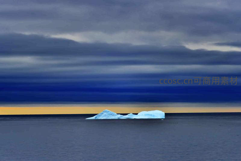 在深蓝与橙黄交织的暮色天际线下,一座孤零零的冰山静卧于无垠海面,构成一幅充满诗意与苍凉感的极地黄昏画卷。