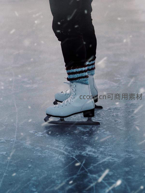 在飘雪的冰面上,一双穿着白色冰鞋的脚正优雅滑行,条纹袜子增添活力,展现冬日运动的浪漫与动感。