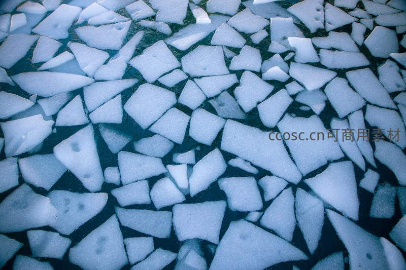 破碎的冰块在深色水面上形成不规则图案,蓝白色调与暗色背景对比强烈,展现冬季自然的冷峻之美。