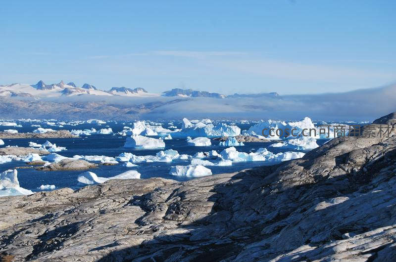 广阔的海湾中漂浮着大小不一的冰山,远处是连绵的雪山,前景为崎岖的岩石,构成一幅壮阔的极地画卷。