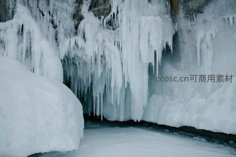 瀑布冻结在岩壁之上,形成壮观的冰柱群,周围积雪覆盖,宛如童话中被施了魔法的冰雪王国。