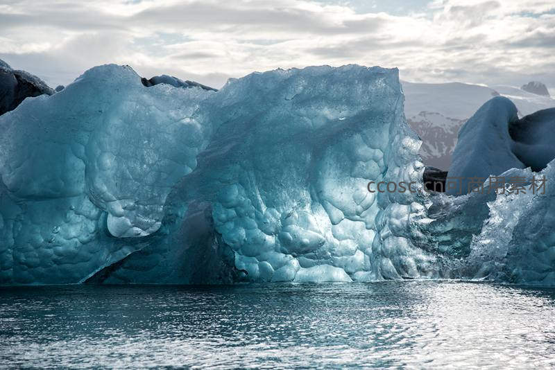 近距离拍摄的巨大冰山,其内部因压缩而形成的密集气泡和深邃纹理,在阳光下透出如宝石般的湛蓝光泽,水面倒影更添神秘与壮美。