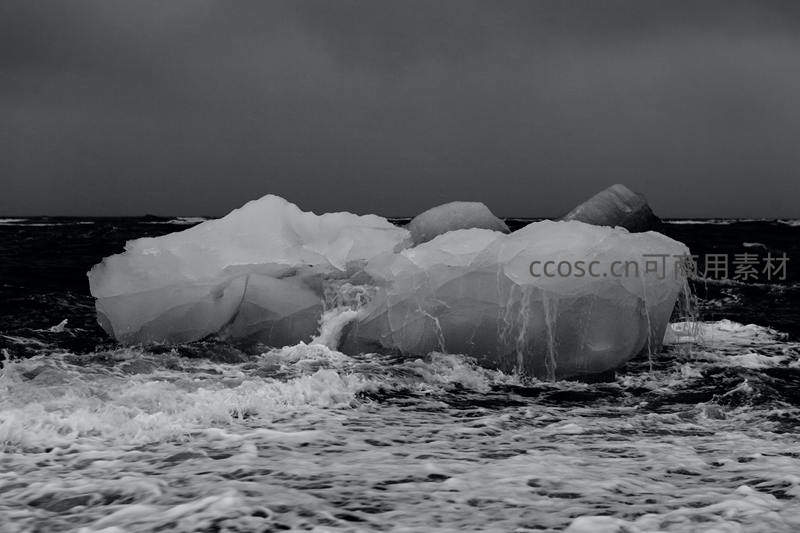 深色海面上漂浮着巨大冰块,浪花拍打其边缘,灰暗天空下展现出自然界的原始力量与肃穆美感,充满戏剧张力。
