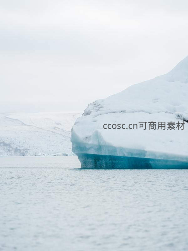 一座覆盖着白雪的巨大冰山静静漂浮在平静海面上,水下部分透出迷人的宝蓝色,令人敬畏。