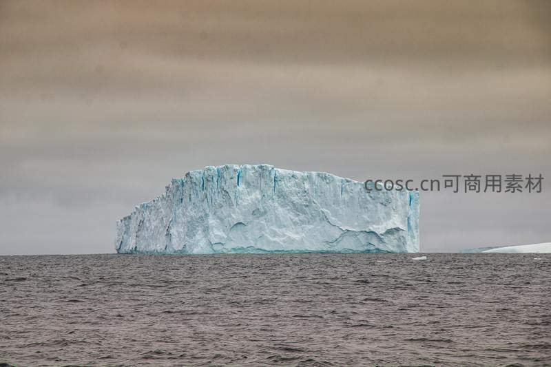 一座巨大的冰墙横亘于波涛起伏的海面,灰蒙天空笼罩其上,冷峻色调渲染出苍凉而宏伟的极地景象,令人敬畏自然的浩瀚与孤寂。