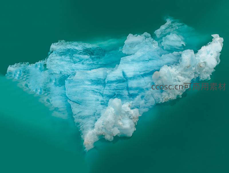 一块巨大的冰山静卧在翡翠般清澈的水域中,冰体呈现层次分明的蓝白纹理,映衬出环境的原始与宁静。