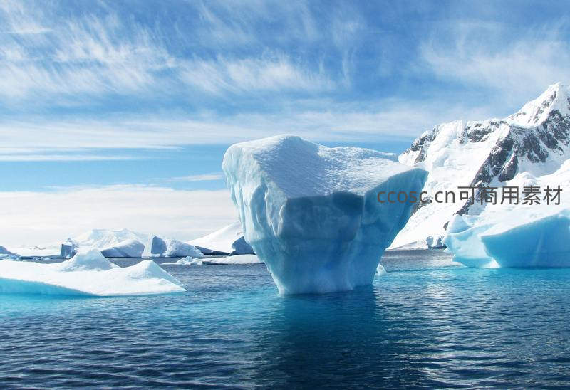 一座造型独特的巨大冰山静卧在清澈的蓝色海水中,背景是连绵的雪山和飘逸的云层,营造出一种宁静而神秘的极地氛围。