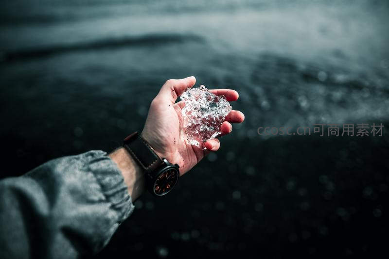一只戴着手表的手掌轻轻托着一块晶莹剔透、边缘开始融化的冰块,背景是模糊的深色沙滩或水域,突显冰与温度对抗的瞬间美感。