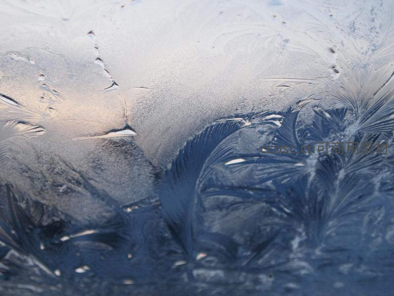 近距离拍摄玻璃窗上形成的霜花,其形态如同羽毛般精致,在蓝色冷调的光影下,展现出大自然鬼斧神工般的细腻纹理和冬日的清冷之美。