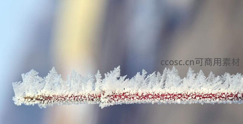 一根细长的枝条上布满了洁白剔透的冰晶,形态各异如微型森林,在柔和光线下闪烁着冷冽的光芒,展现了冬日自然的精致与静谧。