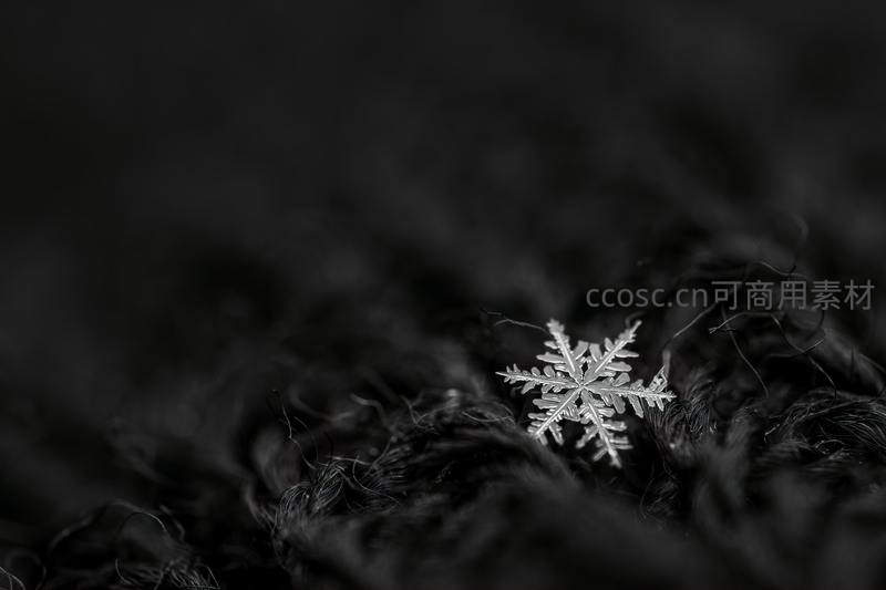 一朵精致六角雪花轻落于深色绒毛表面,黑白对比突出其纤细结构,营造出宁静、纯净而梦幻的冬日微观世界氛围。