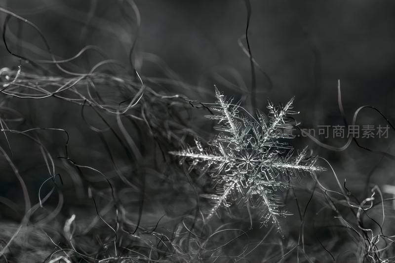 纷繁缠绕的丝线背景中,一朵清晰对称的雪花晶体熠熠生辉,高对比度与精细结构凸显自然造物的秩序与美感。
