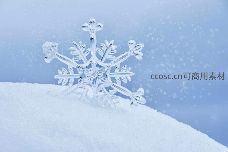 一朵精致的人造水晶雪花轻置于洁白柔软的雪丘上,背景是朦胧飘落的细雪与淡蓝色天空,营造出梦幻纯净的冬日氛围。