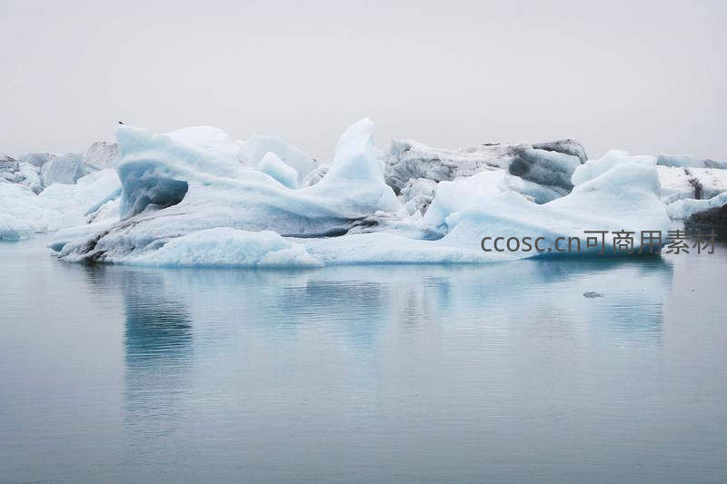 灰蒙天空下,形态各异的巨大冰山静静漂浮于平静湖面,清澈水面倒映着冰块轮廓,呈现极地特有的苍凉与壮美。